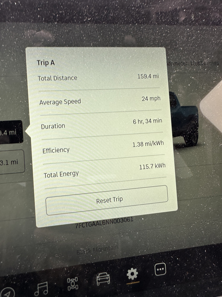 Truck model: 2022 Rivian R1T Launch Edition (with large pack battery – 135kwh and 20’ AT tires)