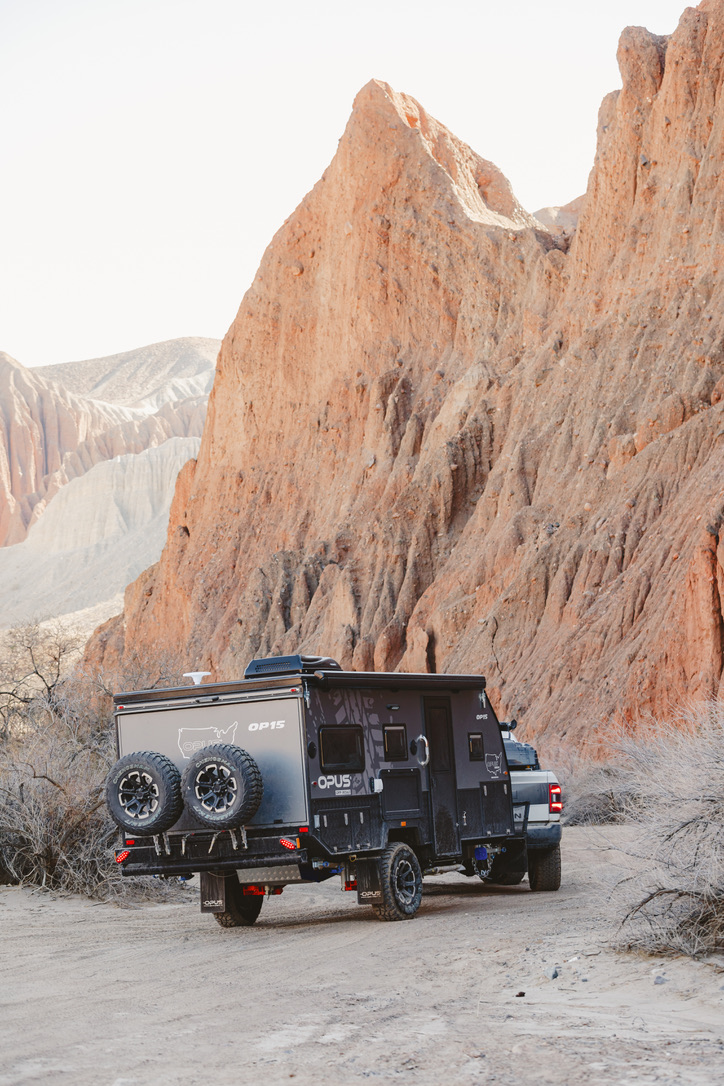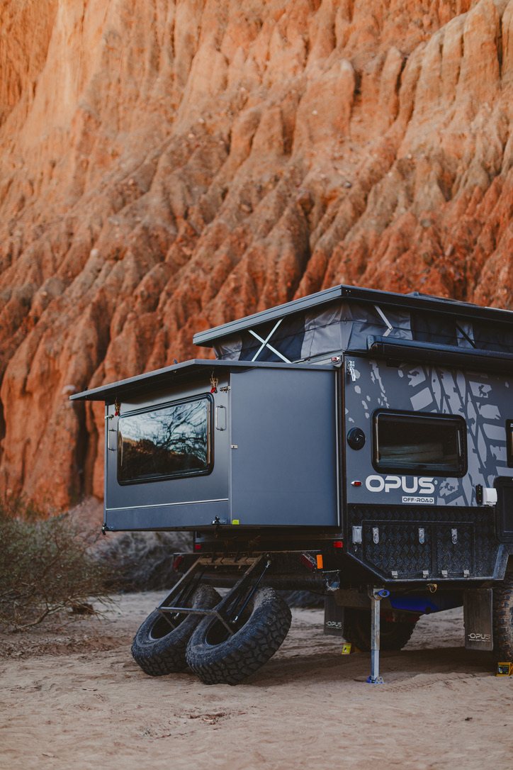 The OP15 comes FULLY LOADED with a 300-watt solar system mounted on the roof, 63 gallons of FRESH water capacity and 2-4 days of built-in battery life. The 2023 models come equipped with a re-engineered suspension for added impact durability in the toughest tow conditions: To do this OPUS increased the size of the springs, added even larger shock absorbers, and repositioned the springs vertically to minimize the wear and improve your off-road experience.